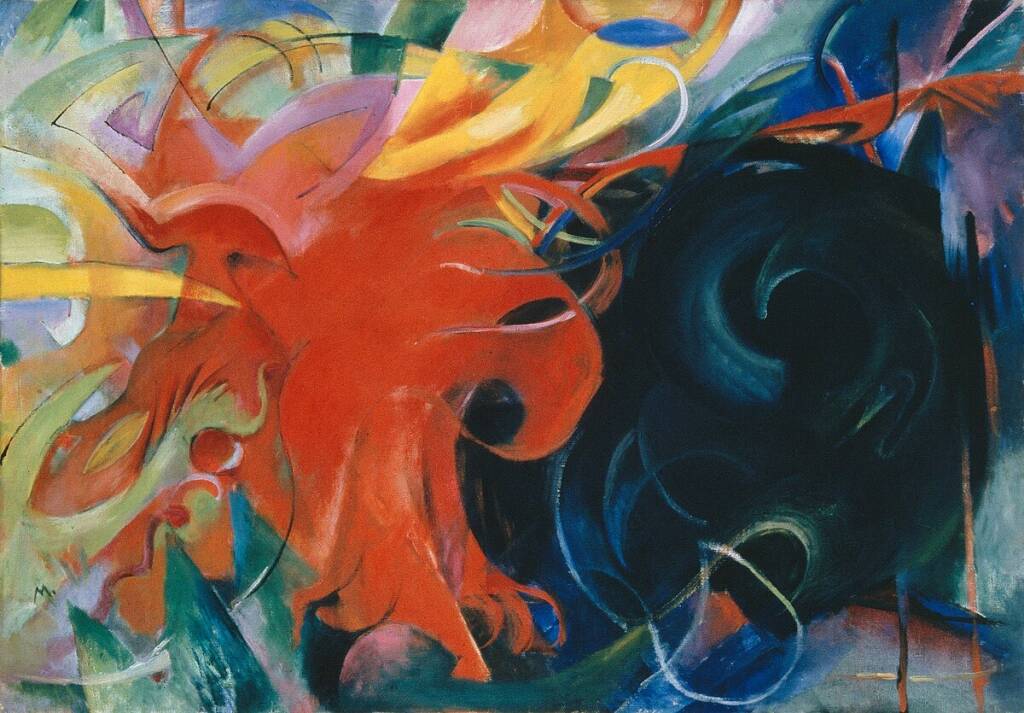 «مبارزه شکلها» یکی از انتزاعیترین و پرانرژیترین آثار مارک است که درست پیش از مرگش خلق شد. بوم پر از دو تودهٔ بزرگ رنگی — قرمز در سمت چپ و آبی در سمت راست — است که با خطوط منحنی و تیز، به نظر میرسد در حال برخورد و نبرد باشند. یانسن این رنگها را مطابق سیستم نمادین مارک تفسیر میکند: قرمز به معنای خشونت و ماده، آبی به معنای معنویت و روح؛ و جدال آنها را انعکاسی از تنشهای پیش از جنگ جهانی اول میداند. روزنتال اضافه میکند که شکلبندی این دو جرم رنگی شبیه به حیوانات یا نیروهای طبیعی عظیم است، اما آگاهانه از بازنمایی مستقیم دوری میکند. لانکهایت، این اثر را «مانیفست انتزاعی مارک» میخواند که در آن، فرم و رنگ بدون کمک از سوژه شناساییپذیر، حامل معنا هستند. استفاده جسورانه از منحنیهای تند و ترکیببندی دینامیک، حس حرکت، برخورد و تغییر را القا میکند. این تابلو، هم اوج و هم پایان مسیر ابداعی مارک در پیوند دادن فلسفه و نقاشی است.