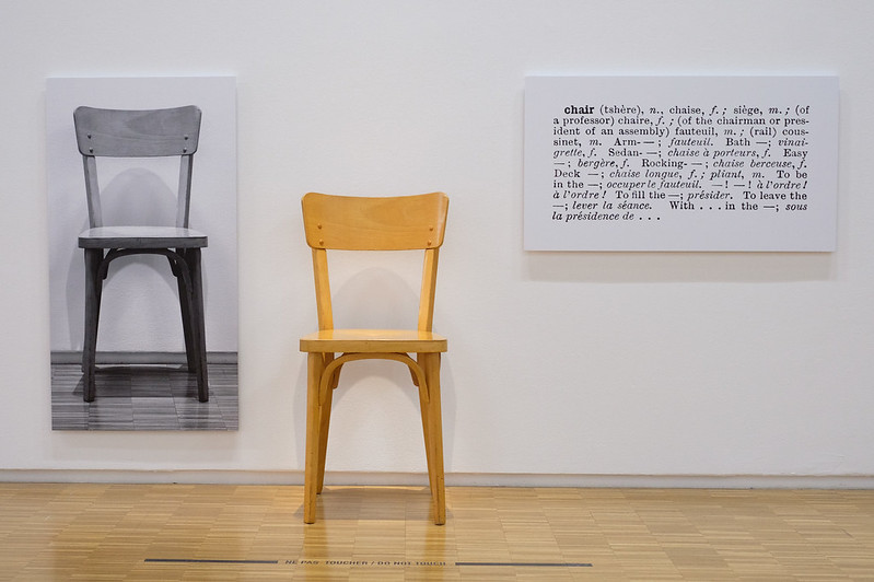 جوزف کوزوث Joseph Kosuth (متولد ۱۹۴۵) با اثر معروف خود «یک و سه صندلی» (One and Three Chairs) که در سال ۱۹۶۵ خلق شد، پرسشهای فلسفی درباره زبان، معنا و بازنمایی را مطرح کرد. این اثر شامل یک صندلی واقعی، عکسی از همان صندلی و تعریف واژهنامهای «صندلی» بود. کوزوث با این اثر، روابط پیچیده میان اشیا، تصاویر و زبان را بررسی میکند و مخاطب را به تفکر درباره ماهیت بازنمایی و معنا وادار میسازد. این نوع پرسشگری درباره مفاهیم بنیادین، یکی از ویژگیهای اصلی تفکر پستمدرن است.