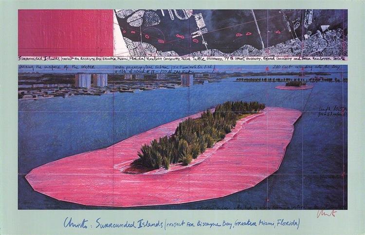 در این پروژه، کریستو و ژان کلود یازده جزیرهی طبیعی در خلیج بیکن (Biscayne Bay)، میامی را به مدت دو هفته با بیش از 600 هزار مترمربع پارچهی صورتی روشن احاطه کردند. این پارچهها چون هالهای عظیم، سطح آب اطراف هر جزیره را پوشاند. این اثر با همکاری صدها نفر اجرا شد و توجه جهانی را به طبیعت، اکوسیستم، و تعامل انسانی-محیط زیست جلب کرد. پروژه با دقت زیستمحیطی انجام و پس از پایان، همه چیز پاکسازی شد.