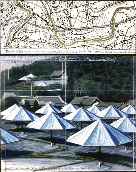 در این پروژه، همزمان ۳۱۰۰ چتر بزرگ (۶ متر ارتفاع و ۸.۶ متر قطر) به رنگ زرد طلایی در کالیفرنیا و آبی در حومه توکیو نصب شد؛ در دو سرزمین با فرهنگها و چشماندازهای بسیار متفاوت. چترها نمادی از زندگی روزمره، موقت بودن و وحدت در عین تفاوت جغرافیایی و فرهنگی بودند. پس از دو هفته، پروژه با جمعآوری کامل به پایان رسید. این اثر پیچیدگی سازمانی عظیمی داشت و مشارکت جوامع محلی و حساسیت به مکان بخشی از ذات پروژه بود.