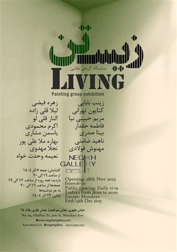 زیستن عنوان نمایشگاهی گروهی است که روز جمعه ۷ آذرماه در گالری نگاه افتتاح شد. در این نمایشگاه آثار پانزده هنرمند بر روی دیوار گالری رفته است و تا پایان يكشنبه ۲۳ آذر در معرض دید بازدیدکنندگان خواهد بود.