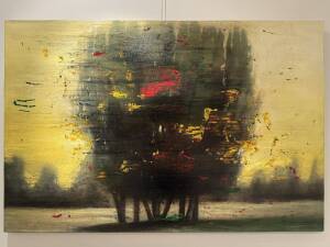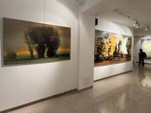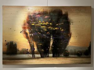 در این مجموعه، هنرمند انگار جوهرهای از امپرسیونیسم را با بیانی شخصی بازآفرینی کرده؛ جایی که کاردکگذاریهای پرحس و بافتدار، نه برای توصیف دقیق جزئیات، بلکه برای القای نور و فضای احساسی به کار رفتهاند. درختان در فضایی محو و مهآلود ظاهر میشدند، انگار در حال فراموشی یا تولدی دوبارهاند؛ بیزمان، بیمکان، اما زنده. یکی از تابلوهای چشمگیر، اثری با زمینهای شبیه غروب و درختانی تیره در میانه بود که حسی از سکوت، سنگینی و رمزآلود بودن را به بیننده منتقل میکرد؛ فضایی که مخاطب میتوانست آزادانه در آن گم شود و مثل وقتی که آدم در میان ابرها دنبال شکل آشنا میگردد، میان شاخهها و برگهای محو و تیره، معنایی شخصی یا احساسی پنهان را کشف کند.